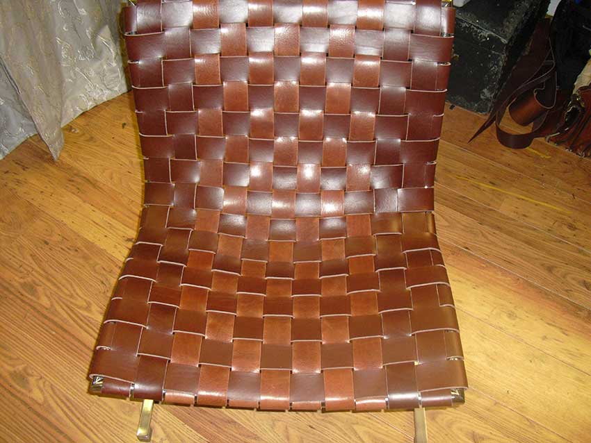 Naast het opnieuw bekleden met leer van design stoelen doet zij dit ook door het leer te vlechten, dit met een prachtig resultaat, bekijk het portfolio gevlochten tuigleer.